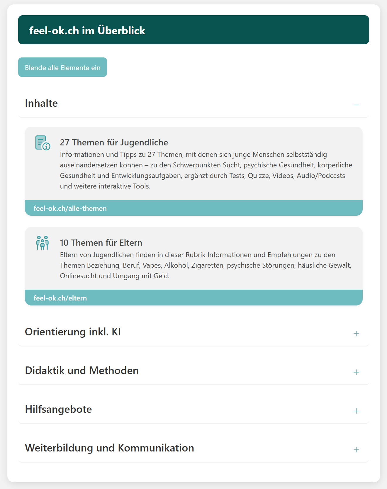 Für eine kompakte Übersicht über alle Angebote von feel-ok.ch empfehlen wir die Seite «feel-ok.ch im Überblick».